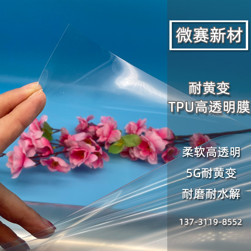 耐黄变TPU高透明膜原料为脂肪族TPU,不含苯环,结构稳定,不容易受紫外线影响,耐黄变可达5G,同时在紫外线照射下无增塑剂释放,达到环保要求。具有TPU膜突出的机械强度、优良的回弹性、宽广的使用温度等综合性能。同时具有卓越的耐化学性及优异的耐老化性,达到耐用、抗污、抗黄变目的,适用于在恶劣条件下的持久使用。光学级高透明、晶点少,达到高清晰度效果。膜面效果可选高透明、雾面、磨砂等多种效果