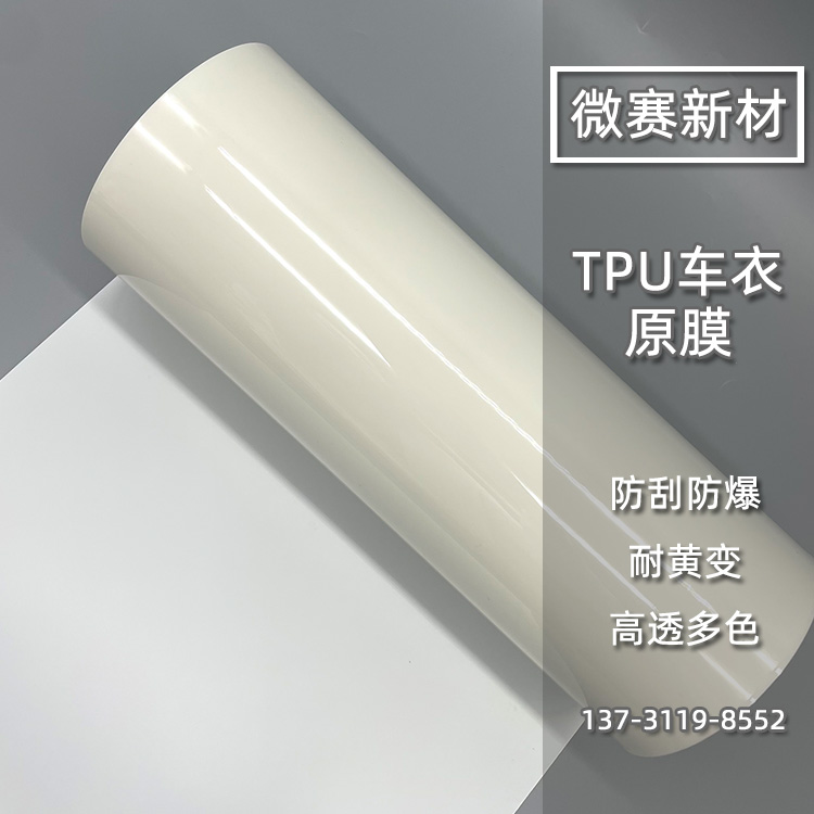 河北微赛专业生产TPU车衣原膜,该材质是一种可热塑性聚氨酯,其物理性能、化学稳定性能比较优秀,是一种成熟的环保材料;我司生产的TPU车衣原膜具有良好的韧性和热修复功能,经加工制成车衣膜后,使用寿命为5-10年。它具有稳定的自动修复能力,其表层独有的致密纳米涂层,除了为其提供强大的抗腐蚀能力外,还能拥有良好的修复能力,在还原的时候不会吸入灰尘,可以长久保持膜的完好和光线亮洁;具有优异的不沾污性能,远离外物腐蚀,长时间不黄变、不开裂等特性。