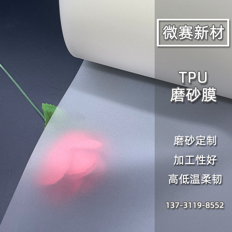 TPU磨砂膜是一种表面带砂面的薄膜,有片状和卷状两种包装,可以根据客户要求的規格进行分切或切片。薄膜可以分为单面磨砂和双面磨砂效果,不同颜色的原膜都可以再次加工成单、双面磨砂膜。磨砂保护膜表面的砂粒粗细也可以分为细、中、粗三种。